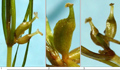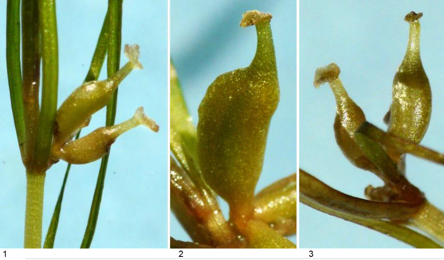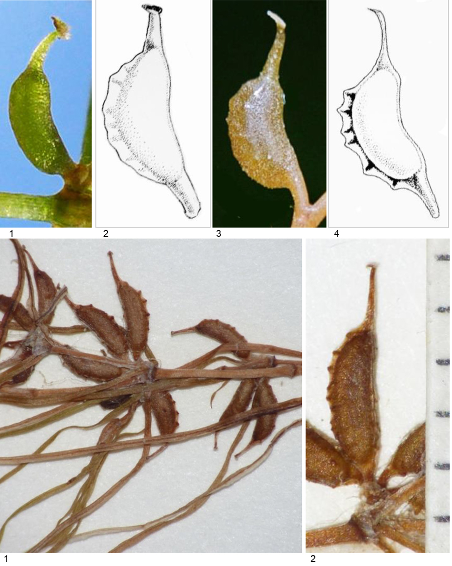 Frutticini: 1 e 2 - Zannichellia palustris; 3 e 4 - Z. pedunculata (foto 1 - N. Kramer, modif., https://calphotos.Berkeley.edu; dis. 2 e 4 - da: TALAVERA & GARCÍA MURILLO, 2010b; foto 3 - J. Quiles Hoyo, http://www.florasilvestre.es); in basso: Zannichellia palustris (Erbario e foto L. Poggiani, determ. Brilli-Cattarini), pozza in alveo nel Metauro a 4 km dalla foce, 9 maggio 1979; in foto 1 il rapporto tra becco e corpo dei frutticini è in media 0,44, in foto 2 il becco è lungo 1,3 mm, il corpo 2,7 mm (rapporto = 0.45) e il pedicello 0,4 mm