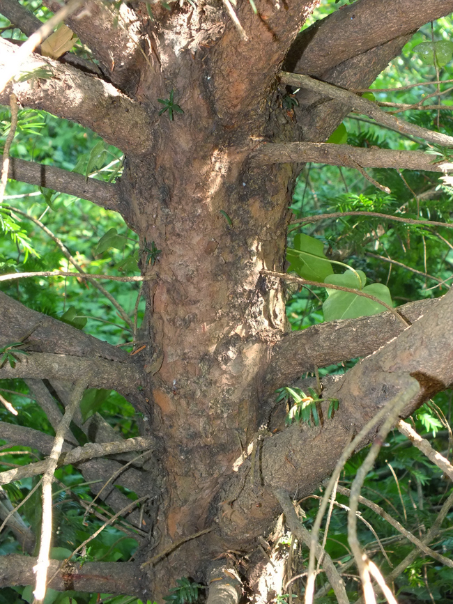 Fusto di Taxus baccata di circa 25 anni, Orto botanico di Casa Archilei a Fano, agosto 2012