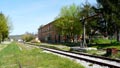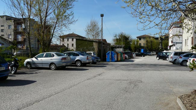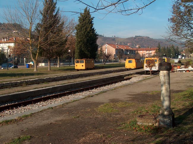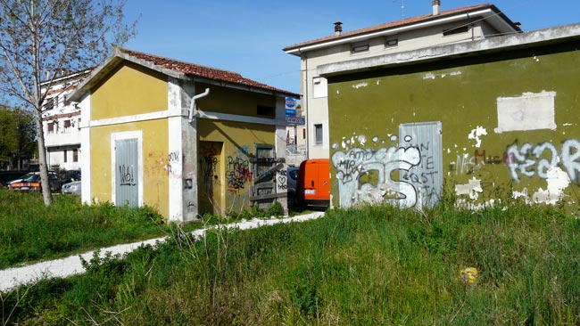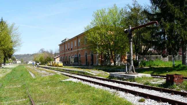 Gli ampi spazi dell'ex stazione di Fermignano sistemati a verde pubblico. Aprile 2015