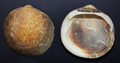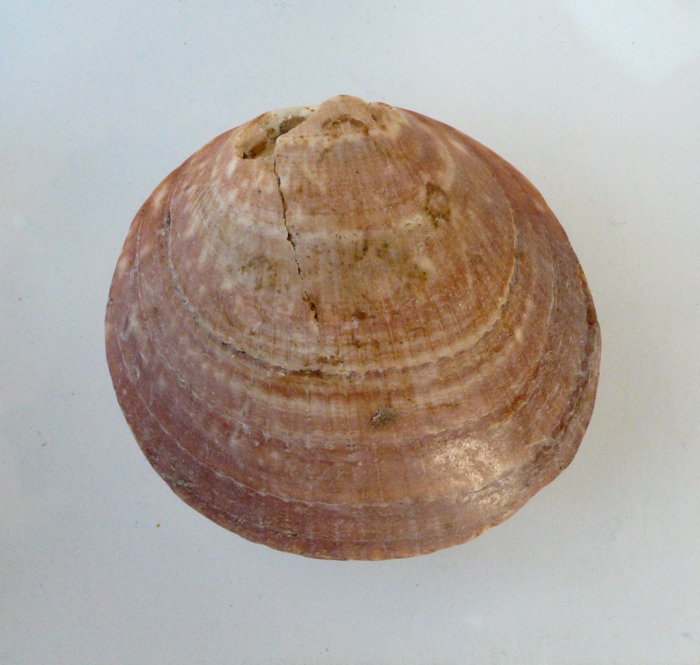 Glycymeris insubrica di 39 mm, villaggio della tarda Età del Bronzo a Chiaruccia di Fano. E' stato praticato un foro nella zona dell'umbone