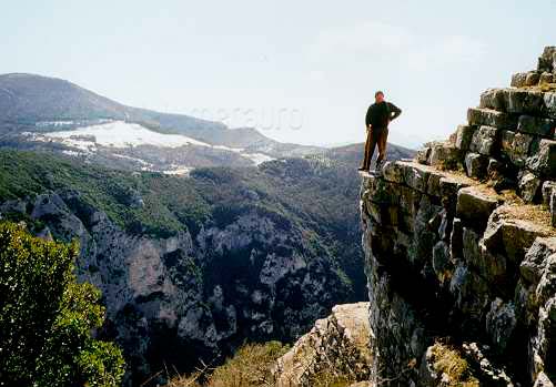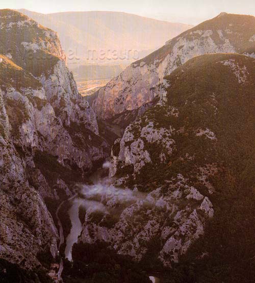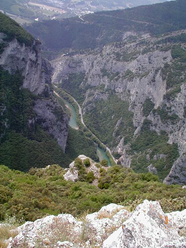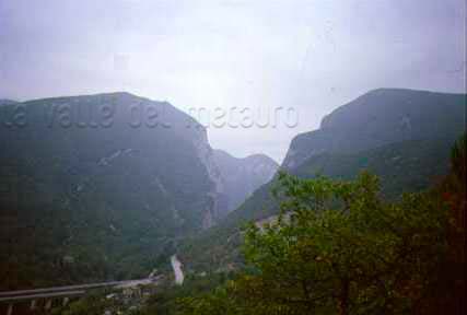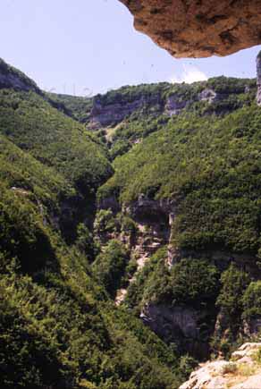 Gola del Furlo vista dal Monte del Ferro (M. Paganuccio), 1995. Sulla sinistra in basso si intravede la Grotta del Grano