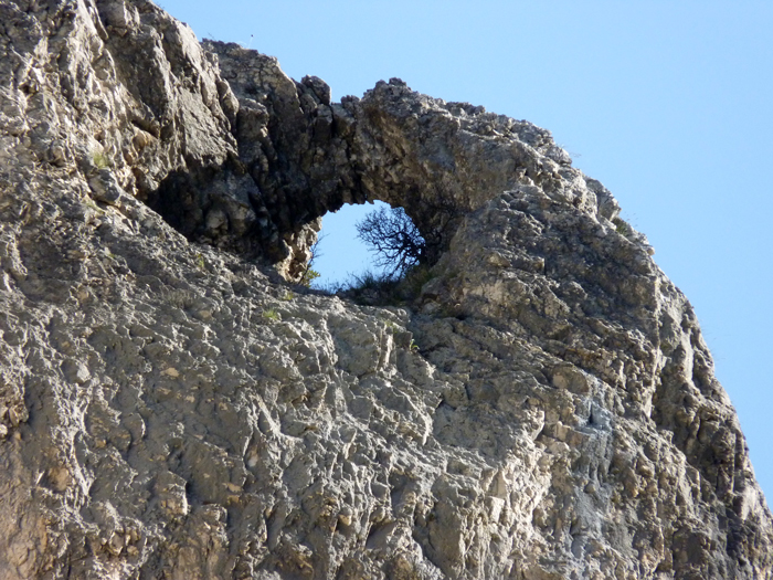 Gola del Furlo, parete del M. Pietralata in corrispondenza della Grotta del Grano con un foro nella roccia, aprile 2011
