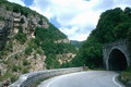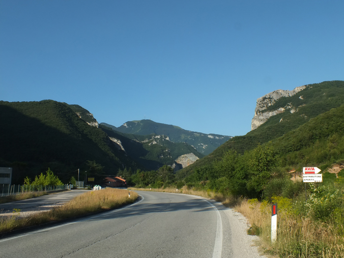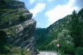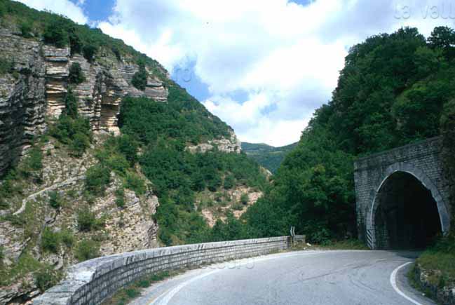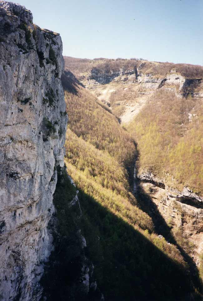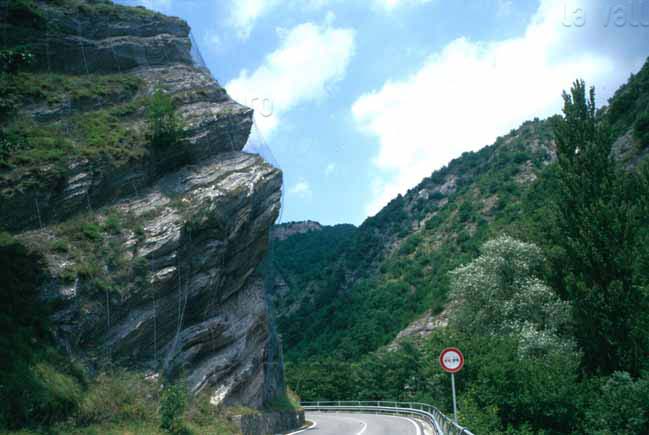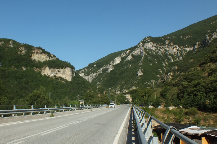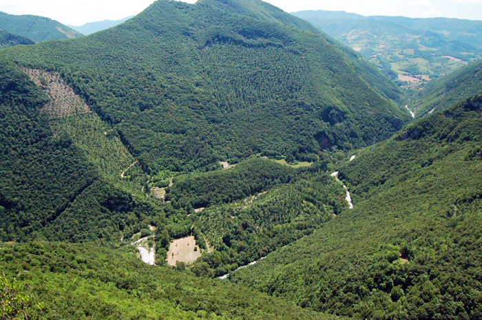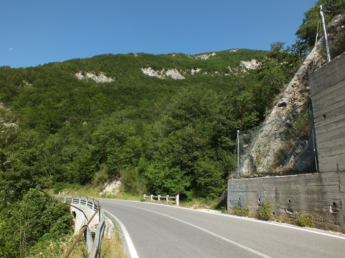 Gola del Bosso 1,3-1,4 km a monte della loc. Eremita, luglio 2012. A destra, sul taglio stradale, la sommità della Maiolica; davanti, verso l’alto, le pendici del M. Fortino (Gruppo del Nerone) con la Scaglia Bianca e le Marne a Fucoidi che spiccano tra il verde del bosco; il vallone coincide coi termini basali, fortemente erodibili, delle Marne a Fucoidi