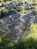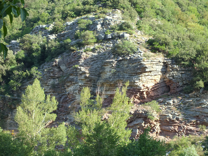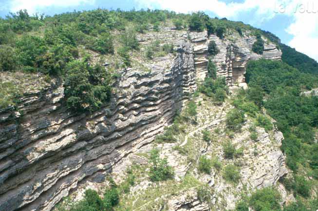 Gola di Gorgo a Cerbara, pendici del M. di Montiego davanti la cava, giugno 2012. Formazione della Corniola: gli strati contorti presenti a più livelli e separati da strati continui, indisturbati, evidenziano la presenza di slump