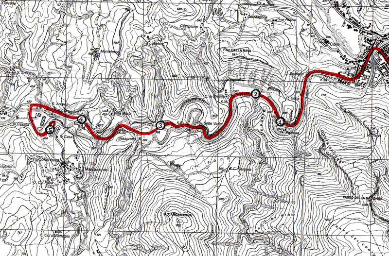 Gola del Biscubio. Carta Topografica d'Italia 1:25.000 F. 290 sez. I - Cagli e F. 290 sez. IV - Apecchio (modificate). In rosso percorso lungo la Strada n. 257 Apecchiese e la strada per Serravalle di Carda. 1 - sosta in loc. Palirosa; 2 - sosta alla confluenza del Rio Vitoschio nel Candigliano; 3 - sosta poco a valle della Fonte di Sassorotto; 4 - sosta 250 m a valle della Chiesa di S. Andrea; 5 - sosta al primo tornante della strada per Colombara - Serravalle di Carda