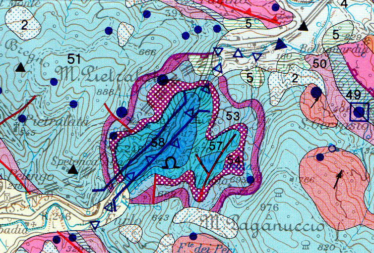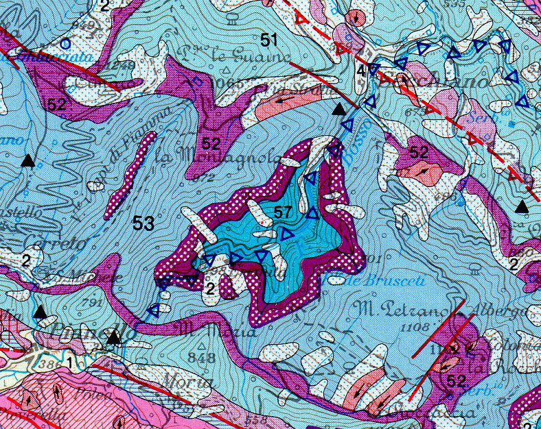 57 (azzurro scuro) - Corniola; 56 (viola scuro) - Formazione del Bosso (1); 54 (viola puntinato bianco) - Calcari Diasprini; 53 (azzurro) - Maiolica; 52 (viola chiaro) - Marne a Fucoidi; 51 (azzurro chiaro) - Scaglia Bianca, Rossa e Variegata; 50 (viola molto chiaro) - Scaglia Cinerea; 2 (bianco puntinato azzurro) - detriti di falda, dell'Olocene e Pleistocene superiore-medio; 1 (bianco) - alluvioni attuali o recenti, dell'Olocene; (rosa con freccia) - accumuli di frana; linee rosse - faglie; triangoli e cerchietti - sorgenti