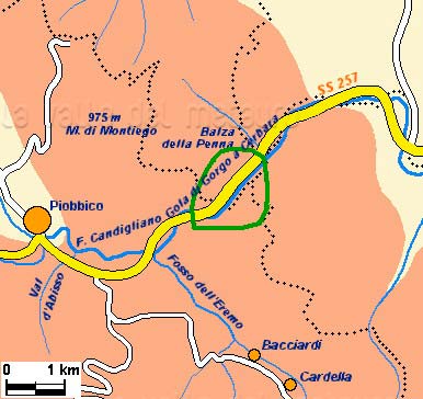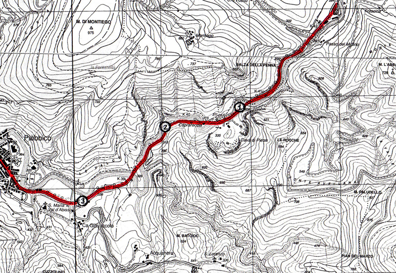 Gola di Gorgo a Cerbara e Candigliano a valle di Piobbico. Carta Topografica d'Italia 1:25.000 F. 279 sez. II - Urbania e F. 290 sez. I - Cagli (modificate). In rosso percorso lungo la Strada n. 257 Apecchiese. 1 - sosta presso la cava di Gorgo a Cerbara; 2 - sosta a monte di Casa Caprareccia; 3 - sosta subito a valle del bivio per Baciardi