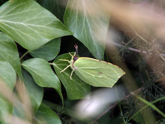 Gonepteryx cleopatra femmina su un cespuglio di Alaterno, collina di M. Giove a Fano, 11 gennaio 2015