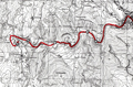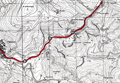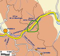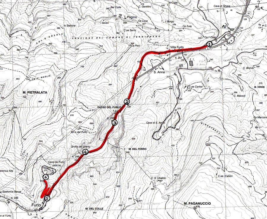 Gola del Furlo. Carta Topografica d'Italia 1:25.000 F. 280 sez. III - Fossombrone (modificata). In rosso percorso lungo la vecchia Flaminia e la strada per il M. Pietralata. 1 - sosta allo spartitraffico strada per Calmazzo; 2 - sosta presso Diga ENEL; 3 - sosta a monte della Galleria di Vespasiano; 4 - sosta presso la Grotta del Grano; 5 - sosta al parcheggio davanti all'Albergo Ristorante Furlo; 6 - sosta alla ex cava del Pietralata
