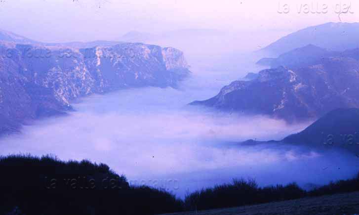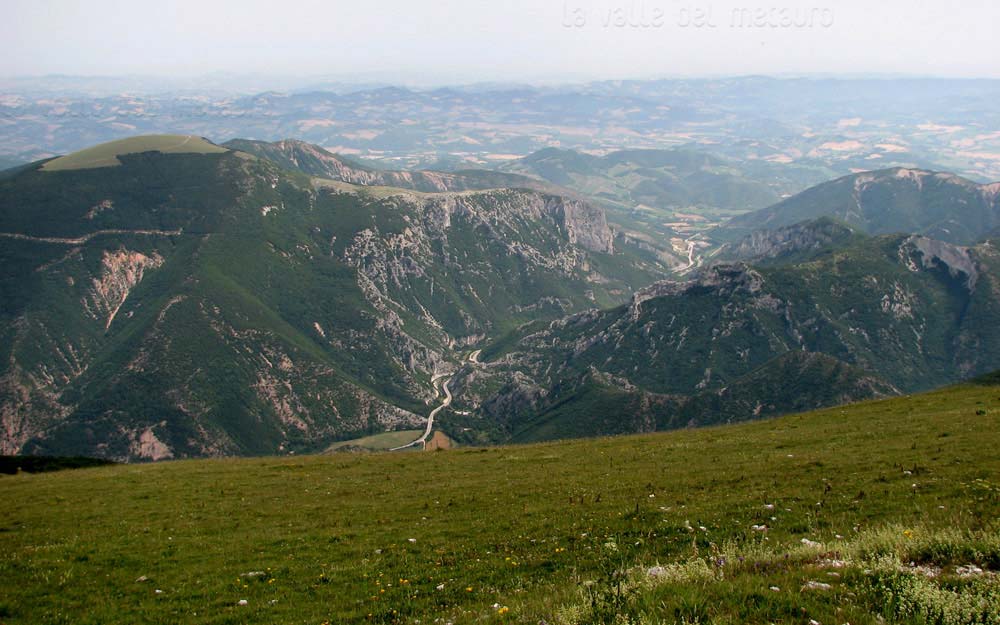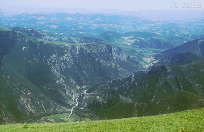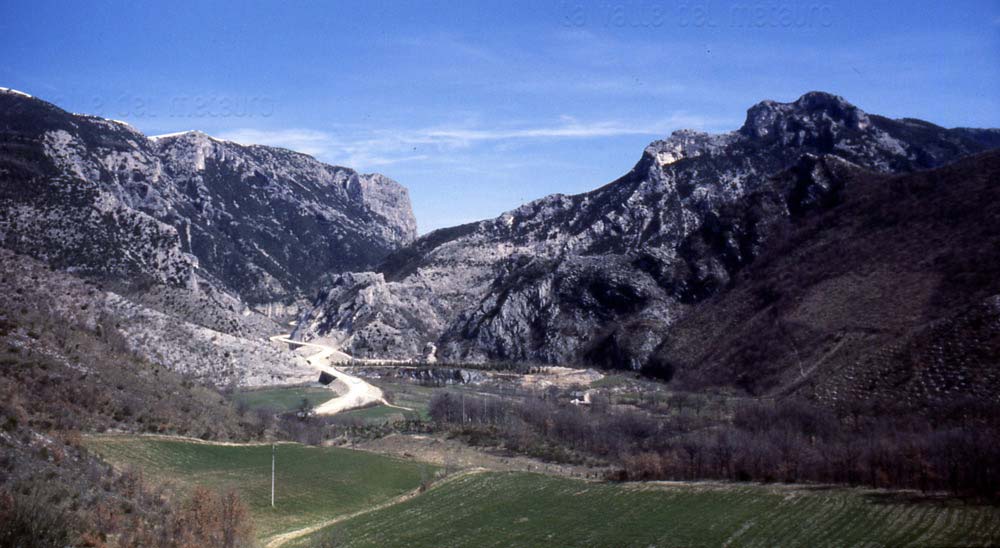 Gola di Gorgo a Cerbara, estremità verso N.E., giugno 2012. A destra la Balza della Penna, a sinistra Le Rocche, al centro la cava di Gorgo a Cerbara, sullo sfondo il M. Nerone