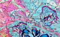 Gola di Gorgo a Cerbara (sulla destra), F. Candigliano e Gola del Biscubio (dal centro verso sinistra) (dalla carta 1:100.000 a cura di CENTAMORE et al., annessa a AA.VV. 1991). 58 (blu) - Calcare Massiccio; 57 (azzurro scuro) - Corniola; 56 (viola scuro) - Formazione del Bosso (1); 54 (viola puntinato bianco) - Calcari Diasprini; 53 (azzurro-lilla) - Maiolica; 52 (viola chiaro) - Marne a Fucoidi; 51 (azzurro chiaro) - Scaglia Bianca, Rossa e Variegata; 50 (lilla chiaro) - Scaglia Cinerea; 48 (lilla acceso) - Schlier; 46 (rosa con linee oblique) - Formazione Marnoso-Arenacea; 2 (bianco puntinato azzurro) - detriti di falda dell'Olocene e Pleistocene superiore-medio; 1 (bianco) - alluvioni attuali o recenti dell'Olocene; (rosa con freccia) - accumuli di frana; linee rosse - faglie; cerchietti, triangoli, quadratini - sorgenti