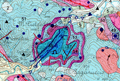 Gola del Furlo tra i monti Paganuccio e Pietralata (dalla carta 1:100.000 a cura di CENTAMORE et al., annessa a AA.VV. 1991, modificata). 58 (blu) - Calcare Massiccio; 57 (azzurro scuro) - Corniola; 54 (viola puntinato bianco) - formazioni del Bosso e del Bugarone, cf. colonna stratigrafica; 53 (azzurro-lilla) - Maiolica; 52 (viola) - Marne a Fucoidi; 51 (azzurro chiaro) - Scaglia Bianca, Rossa e Variegata; 50 (lilla chiaro) - Scaglia Cinerea; 49 (azzurro chiaro a linee orizz.) - Bisciaro; 48 (lilla acceso) - Schlier; 5 (bianco a linee azzurre) - alluvioni terrazzate del Pleistocene medio; 2 (bianco puntinato azzurro) - detriti di falda dell'Olocene e Pleistocene superiore-medio; 1 (bianco) - alluvioni attuali o recenti, dell'Olocene; (rosa con freccia) - accumuli di frana; linee rosse - faglie; linee blu - gole; segno omega - grotte; cerchietti, triangoli, quadratini - sorgenti