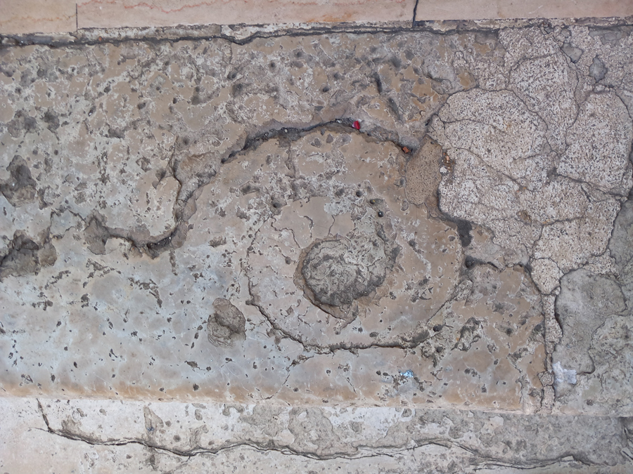 Grossa ammonite presente nello scalino del portico della Chiesa di Santa Maria Nuova, aprile 2025