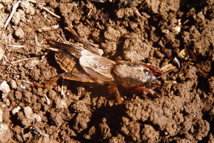 Gryllotalpa gryllotalpa (foto Museo di Tolosa, CC BY-SA 4.0); in basso: Gryllotalpa sp., orto di Casa Archilei alla periferia di Fano, giugno1998 (foto L. Poggiani)