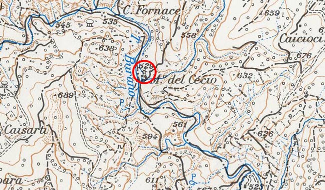 Gubbio (Provincia di Perugia): Mulino del Cecio. Carta top. Reg. Marche 1:25.000 116 – III (autorizz. Ufficio Cartografia e Inform. Territoriali Reg. Marche del 13-3-1999 e aut. IGM n. 4877 del 2-11-1998)