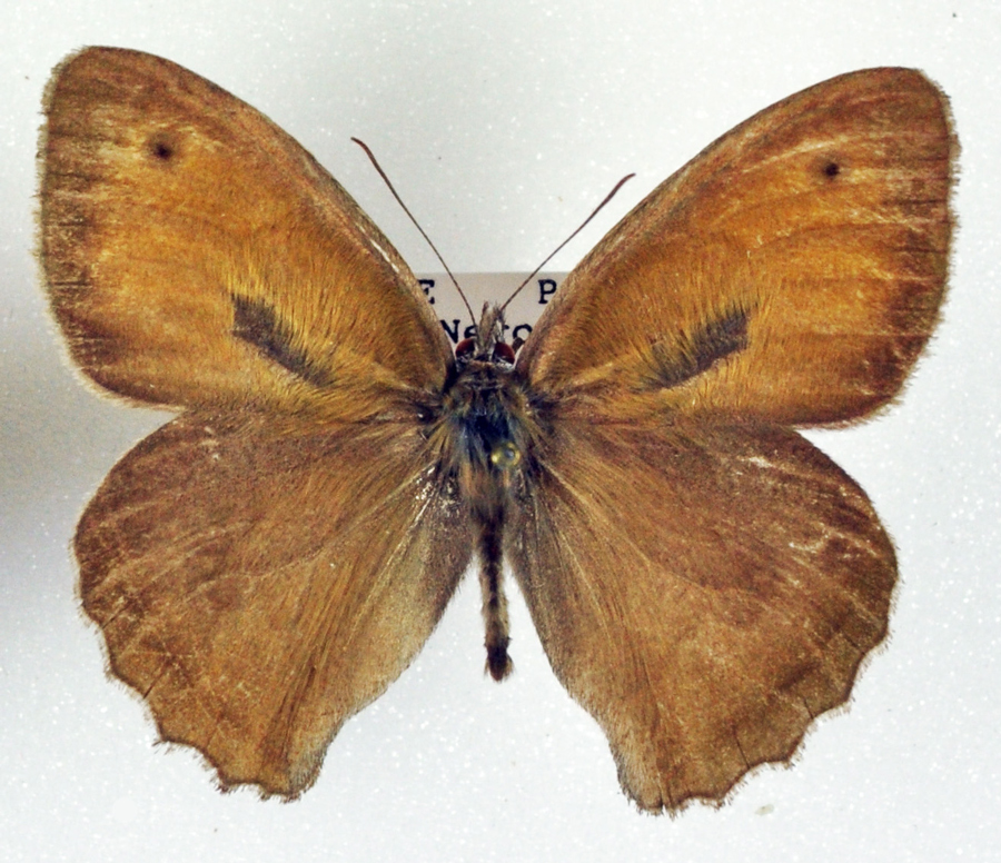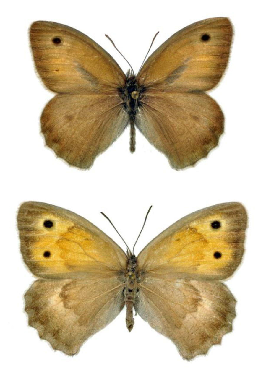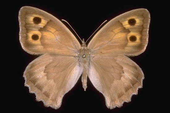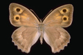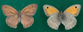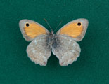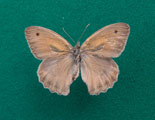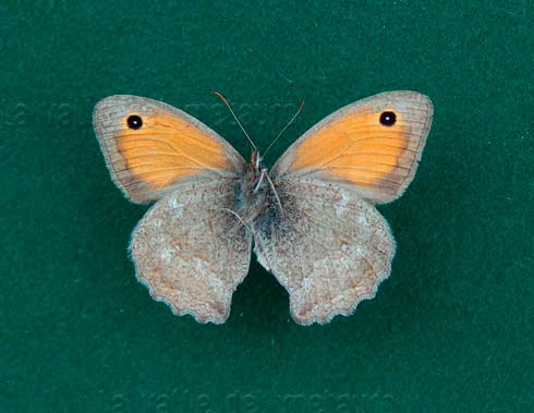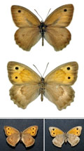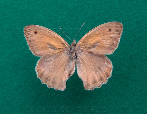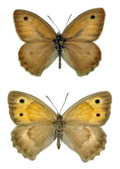 Hyponephele lupina maschio (ala anteriore 22 mm); a destra: sua parte inferiore, T. Mandrale (Gruppo del M. Catria), luglio 1992