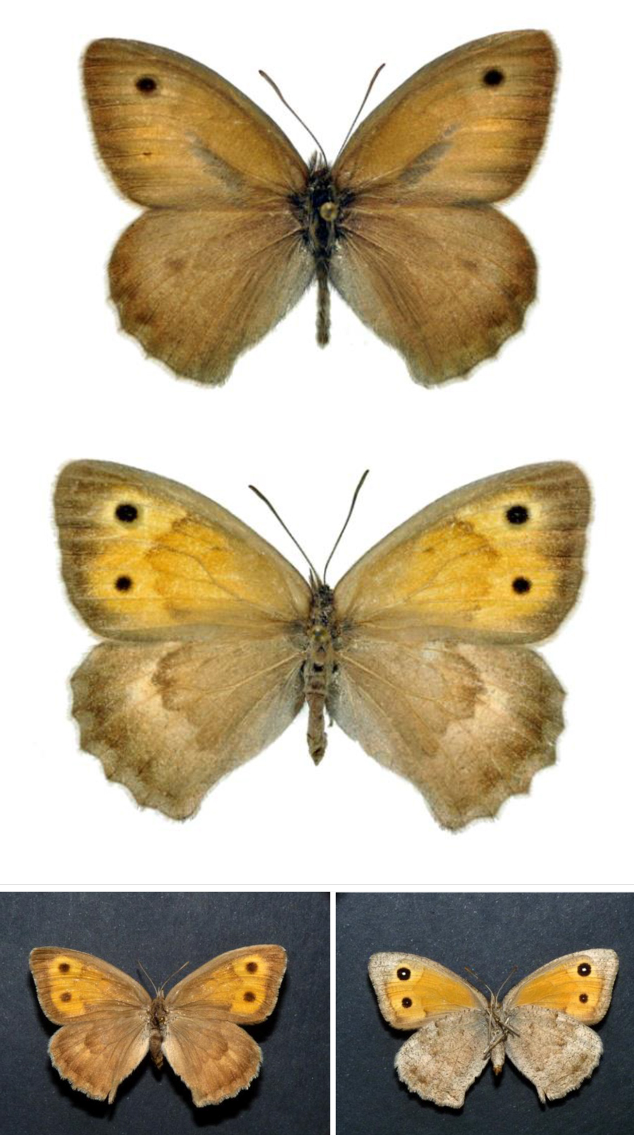 Hyponephele lycaon maschio, M. Rotondo (Monti Sibillini); in mezzo: femmina, M. Nerone, agosto 1981 (foto G. Fiumi); in basso: Hyponephele lycaon femmina, M. Tenetra (Gruppo del M. Catria), agosto 1991; a destra: sua parte inferiore (foto L. Poggiani)