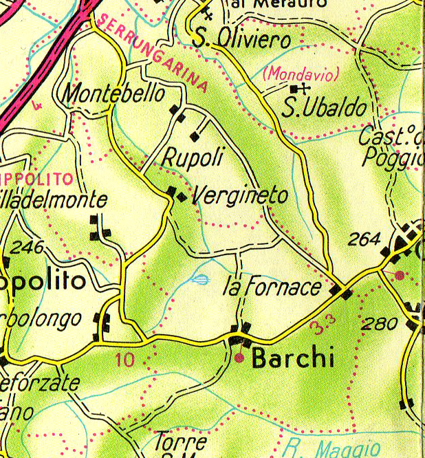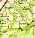 Il territorio comunale di Barchi (da: Carta stradale Provincia Pesaro e Urbino 1: 150.000, L.A.C., Firenze)