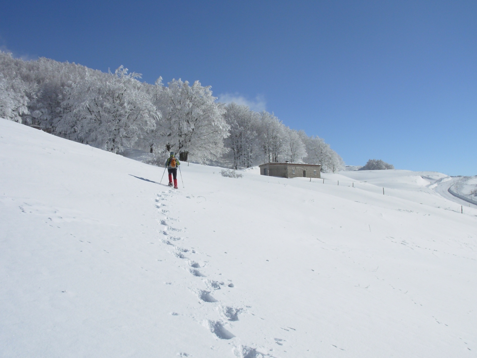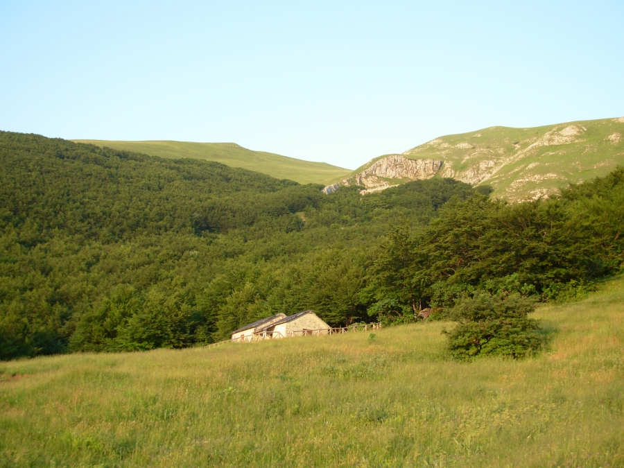 Il rifugio delle Fontanelle e sullo sfondo la cresta ovest denominata “le Gobbe” che sale verso la cima del monte Nerone Giugno 2019