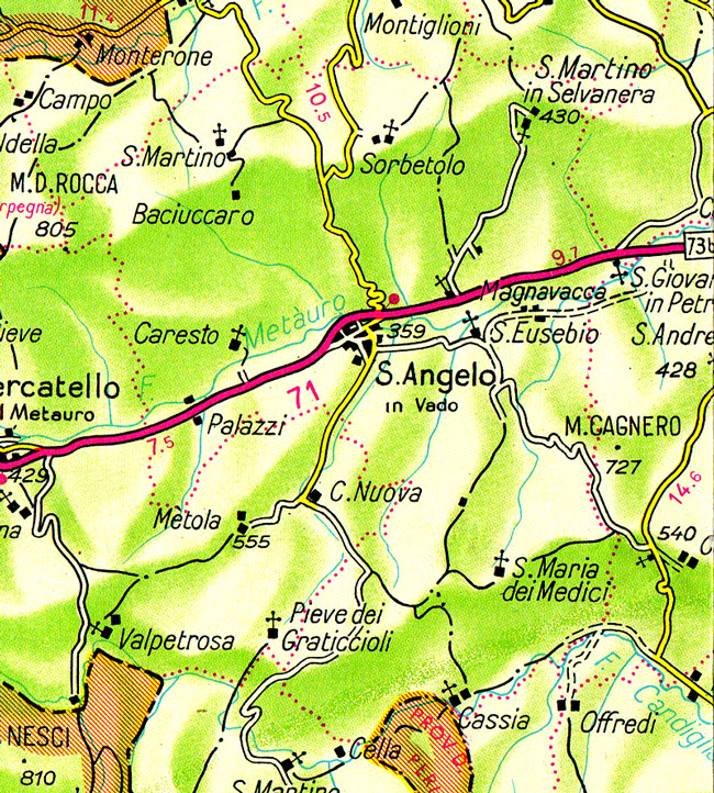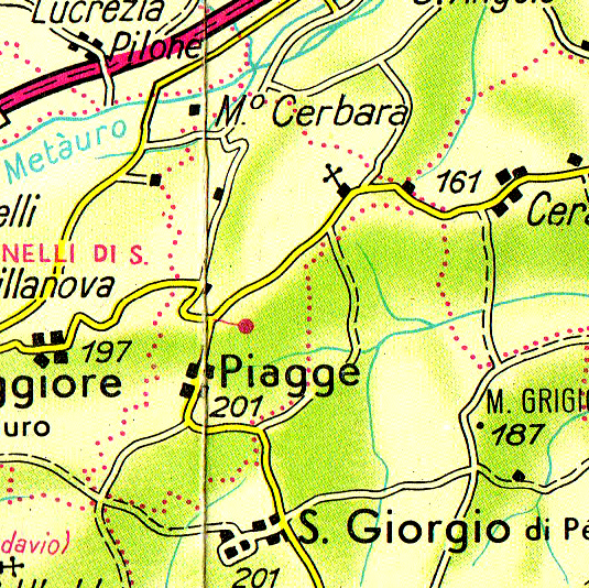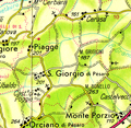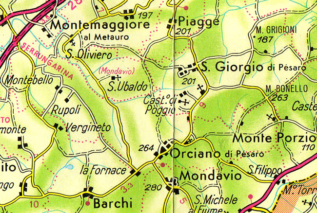 Il territorio comunale di Piagge (da: Carta stradale Provincia Pesaro e Urbino 1: 150.000, L.A.C., Firenze)