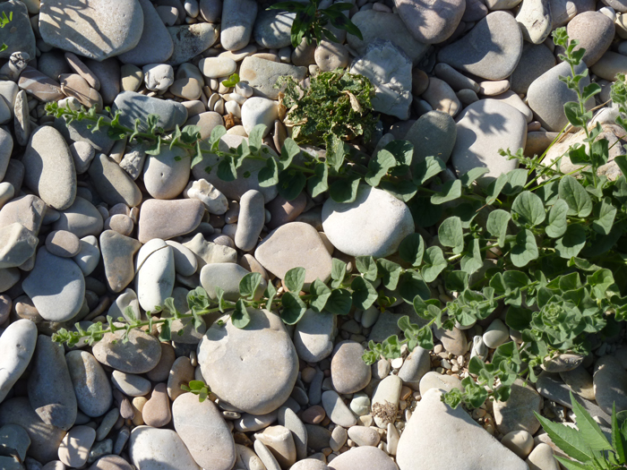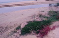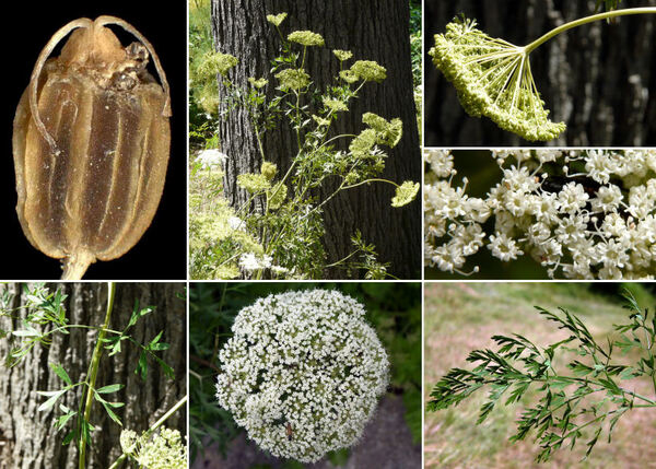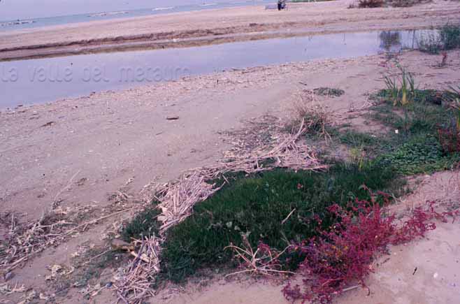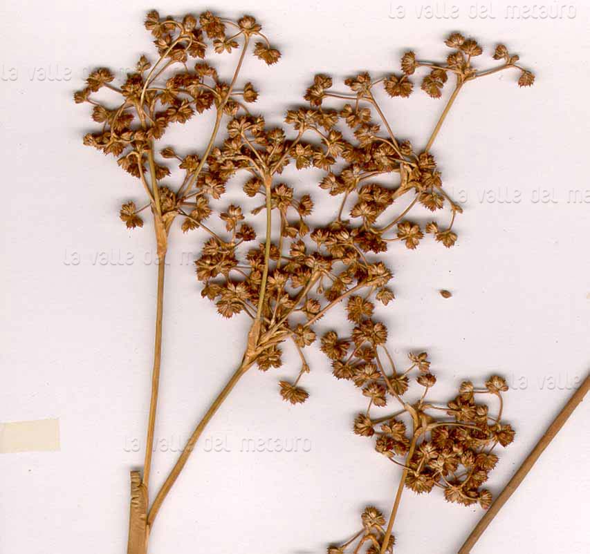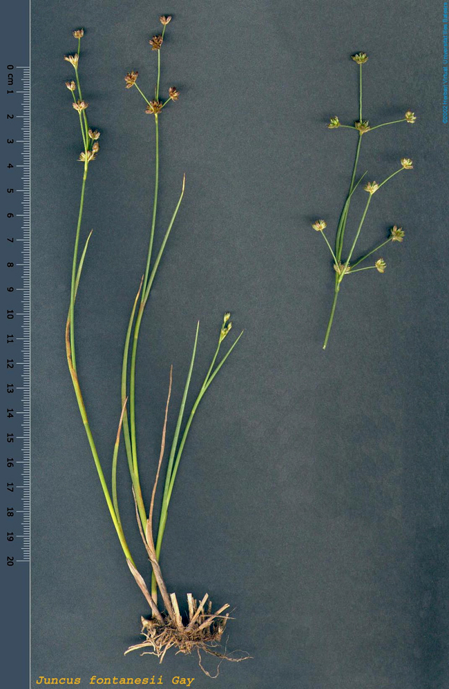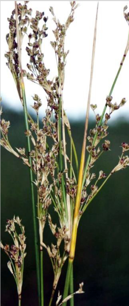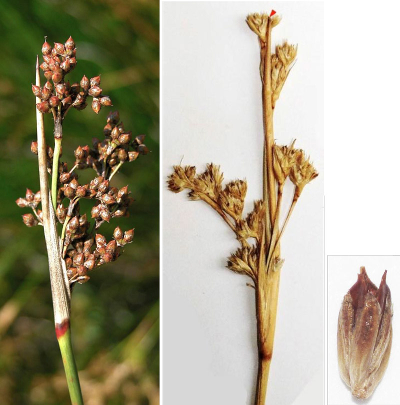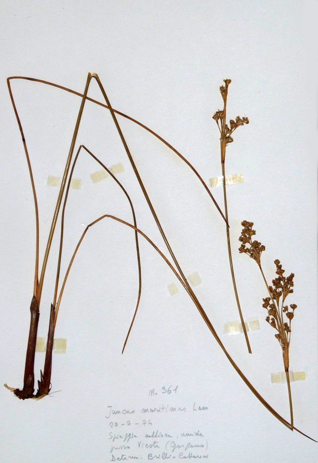 Juncus maritimus, Orto botanico del Comune di Padova, agosto 2004 (foto Andrea Moro, http://dryades.units.it/floritaly, licenza CC BY-SA 4.0); al centro: J. maritimus (Erbario e foto L. Poggiani, determ. Brilli-Cattarini), spiaggia a Vieste (Puglia), luglio 1974; guaina inf. della stessa lunghezza dell’infruttescenza (in rosso l’apice della guaina); a dx: suo frutto (capsula) di lunghezza quasi uguale ai tepali posti attorno