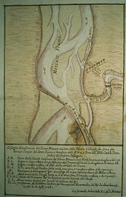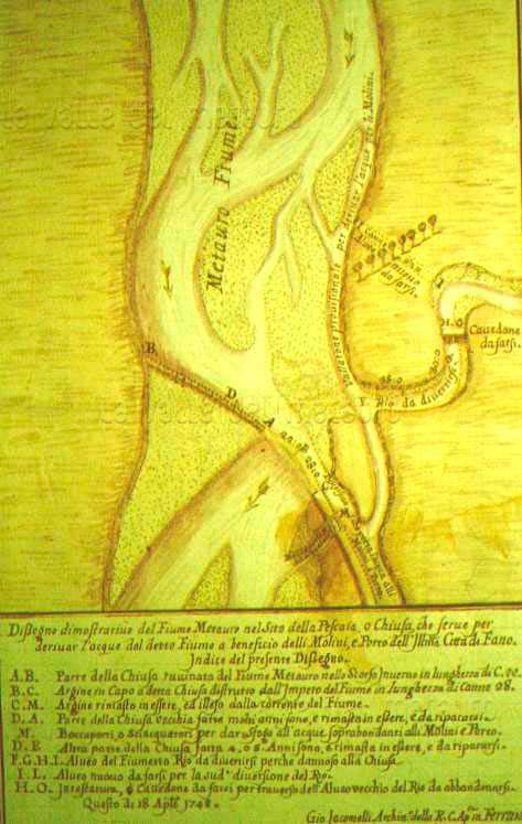 La Chiusa in un disegno del 1748. Giovanni Jacomelli, Pianta della zonadella Chiusa del Fiume Metauro di Fano, con progetto di varianti, 1748 Biblioteca Federiciana di Fano, Sala Manoscritti, Disegni, B3 - 45.