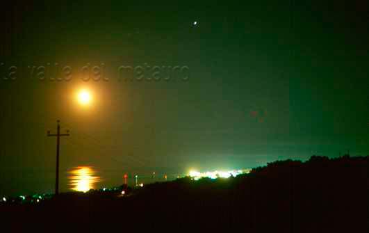 La Luna riflette la luce sul mare. Lasciando il sito di Col delle Cave e spostandosi sulle colline di S. Biagio, l'inquinamento luminoso di Fano non è più occultato dalle colline