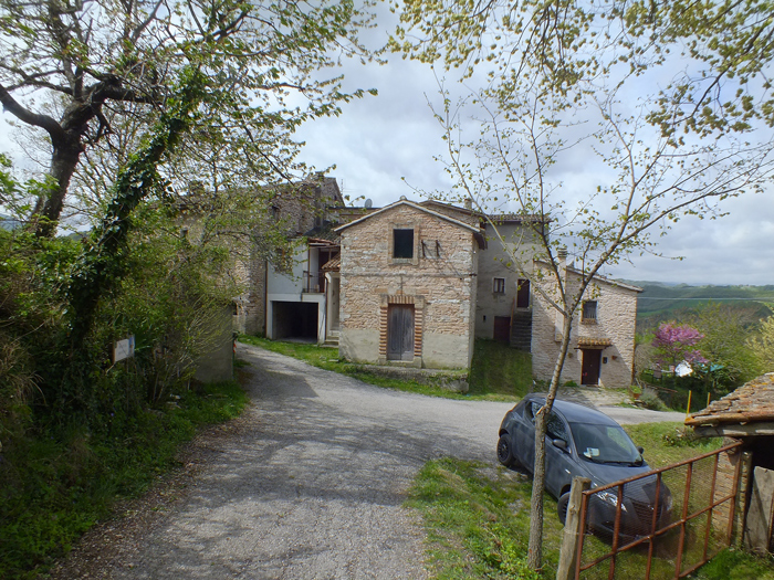 Le Ville sulle pendici del Gruppo del Montiego a Piobbico, maggio 2015. L'edificio al centro è la chiesetta