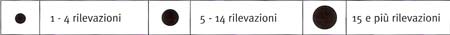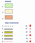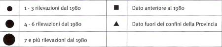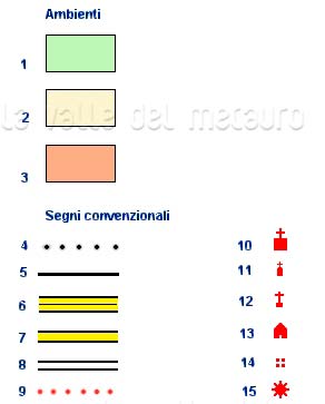 Legenda delle carte degli itinerari: 1 - Ambiente di pianura e bassa collina, prevalentemente coltivato. 2 - Ambiente di collina, coltivato, con qualche bosco e pascolo. 3 - Ambiente di alta collina e montagna, con prevalenza di boschi e pascoli. 4 - Confini comunali. 5 - Linee ferroviarie. 6 - Autostrade e superstrade. 7 - Altre strade principali. 8 - Strade secondarie. 9 - Itinerari. 10 - Edifici religiosi. 11 - Edicole religiose e cappelle. 12 - Croci. 13 - Edifici civili di interesse architettonico. 14 - Ruderi e aree archeologiche. 15 - Mulini ad acqua, ex mulini trasformati in centrali idroelettriche