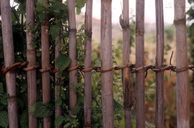 Legatura delle canne con vimini in una recinzione, campagna di Cartoceto, 1988