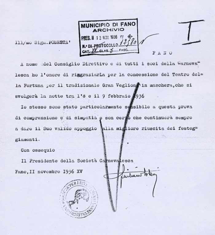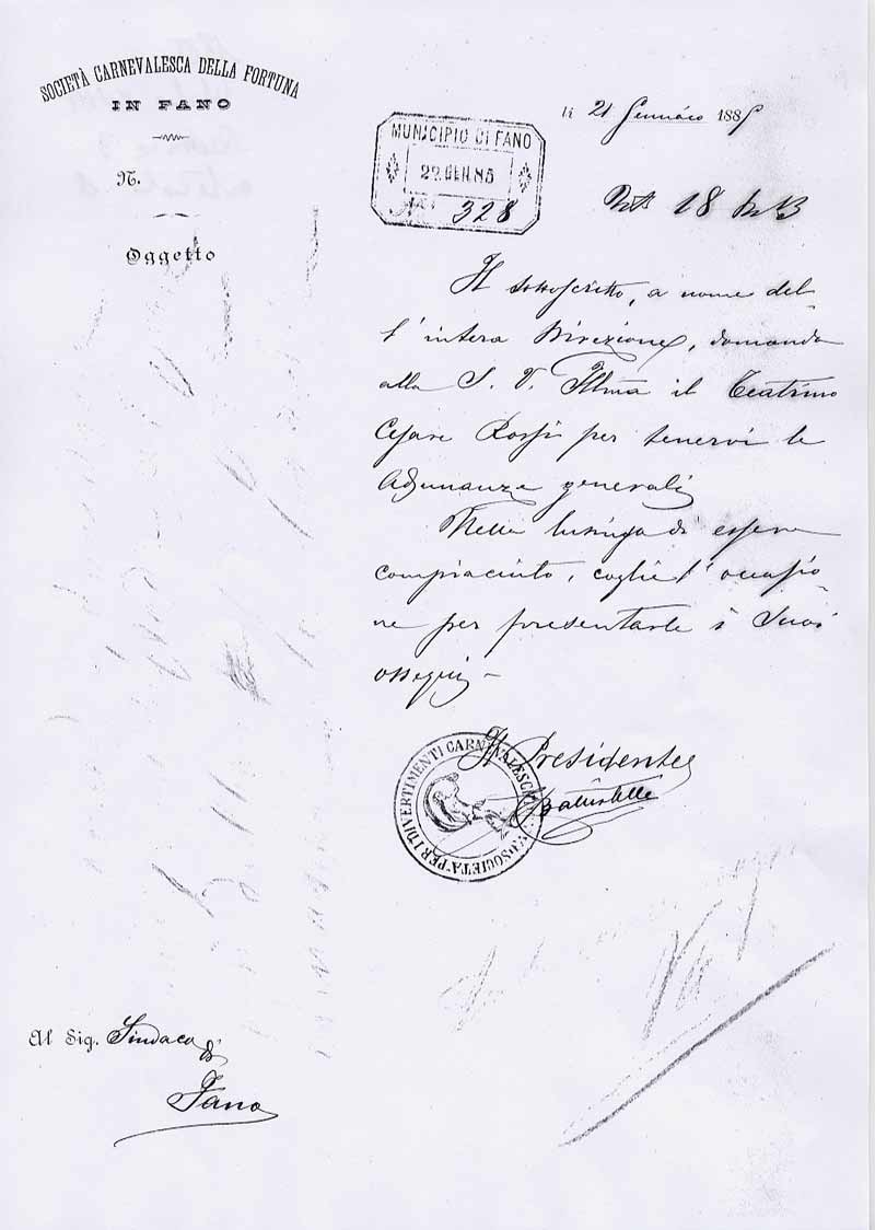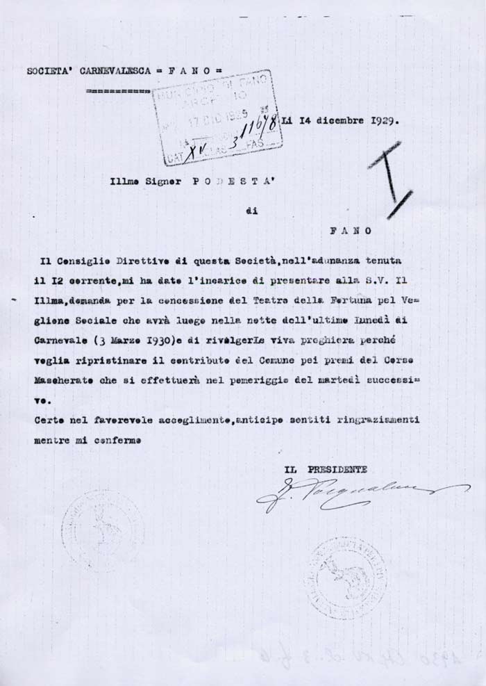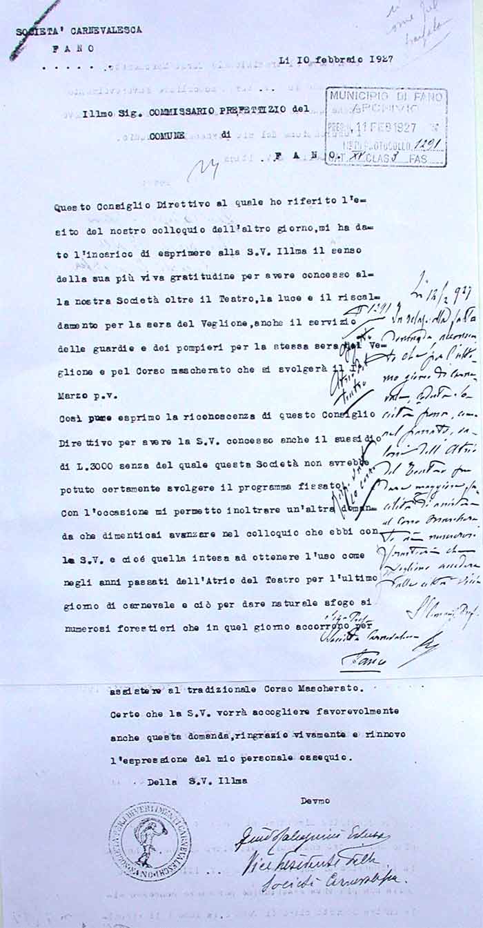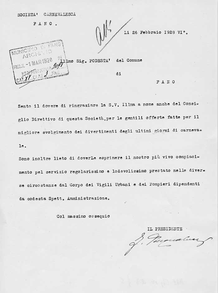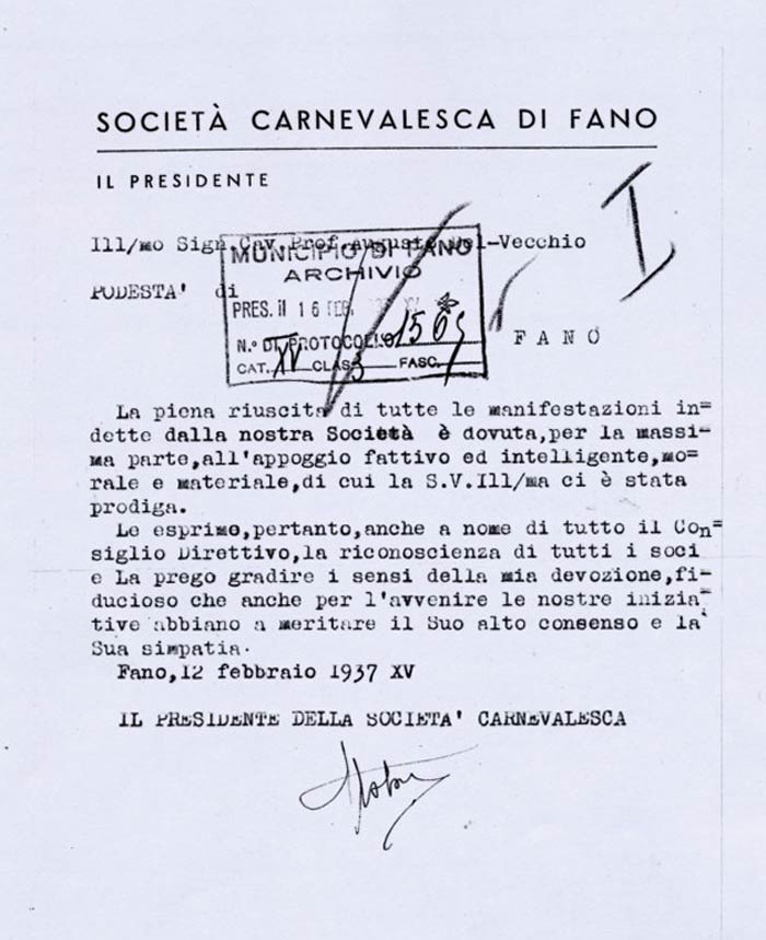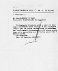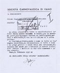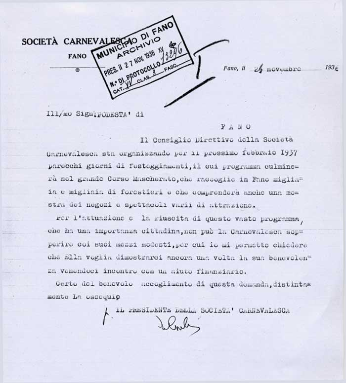 Lettera della Società Carnevalesca al Sindaco di Fano