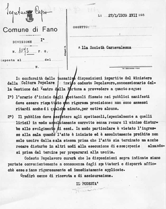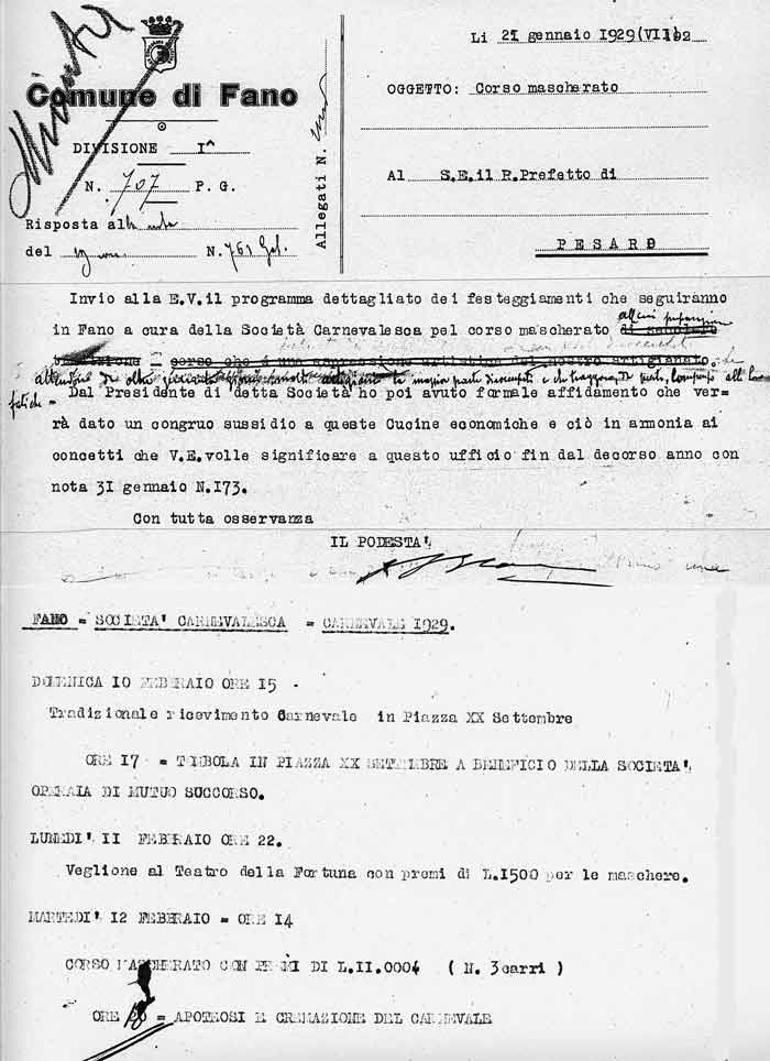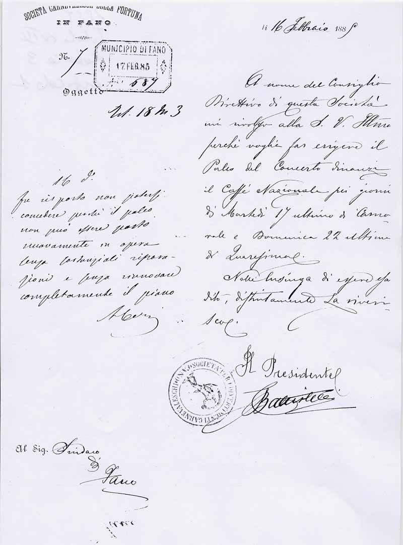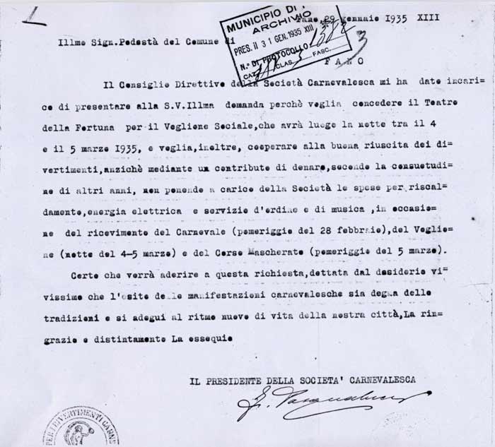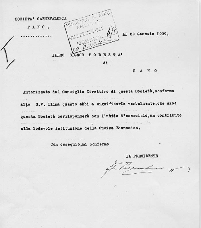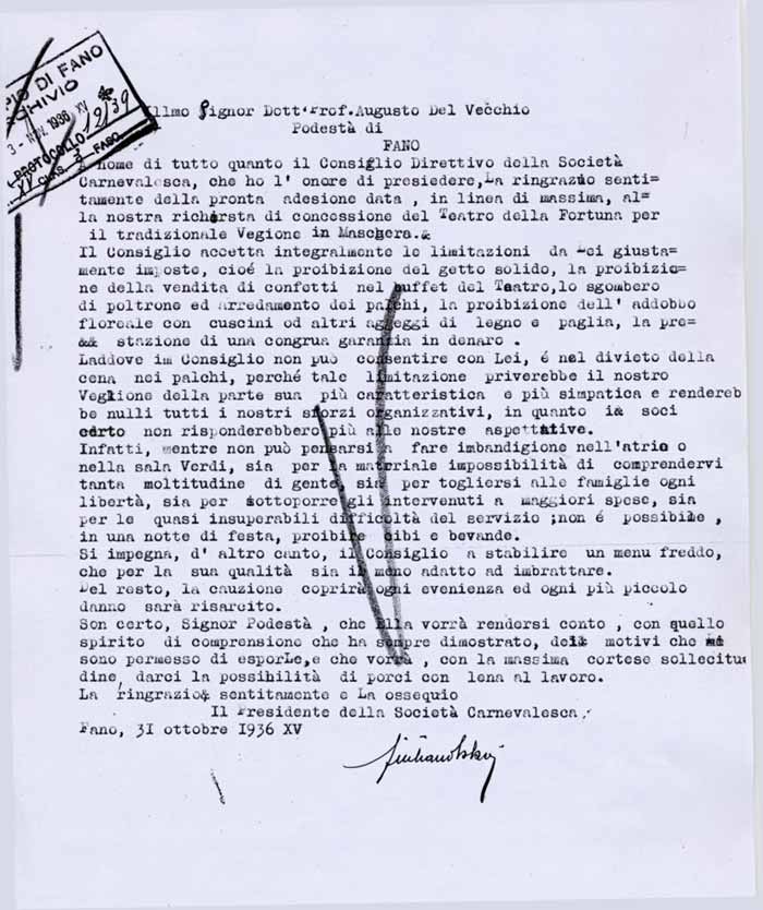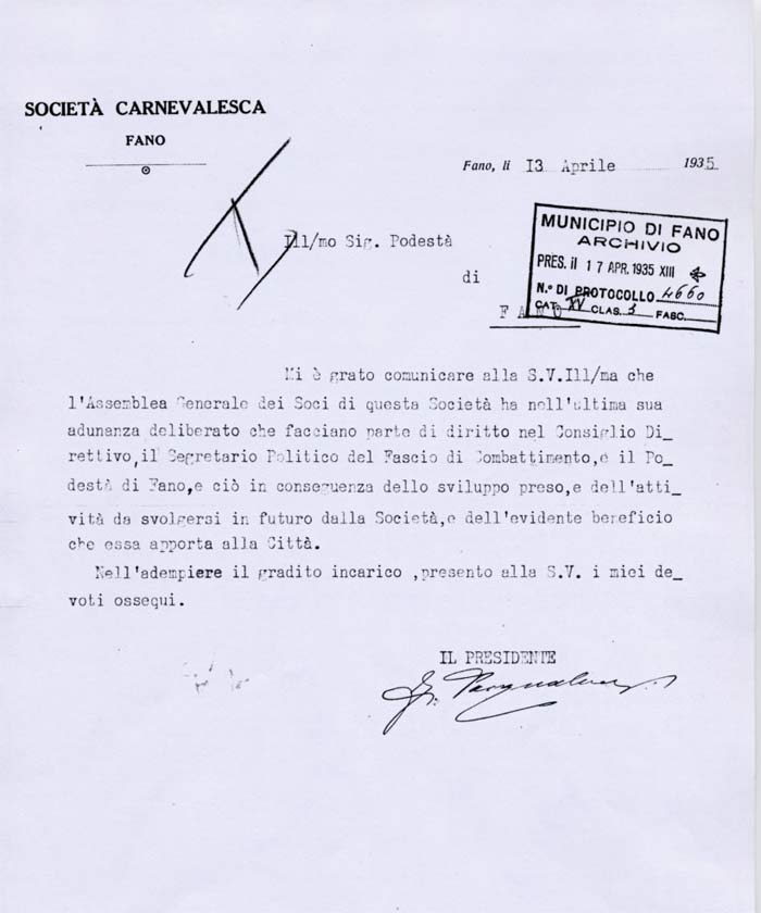 Lettera della Società Carnevalesca al Sindaco di Fano
