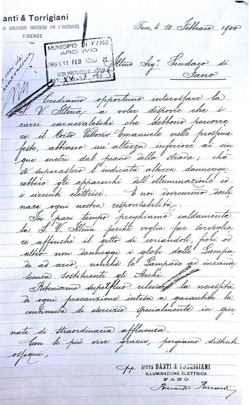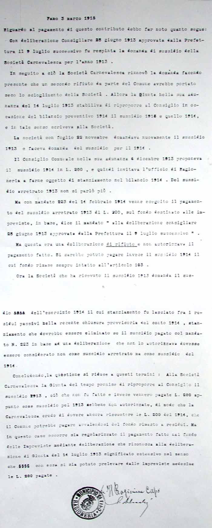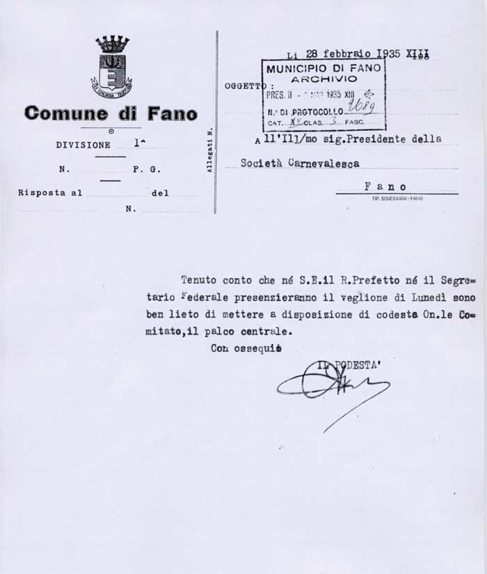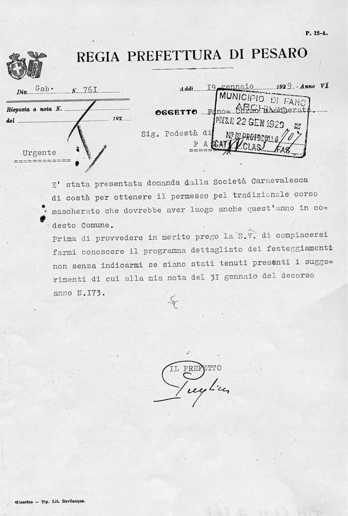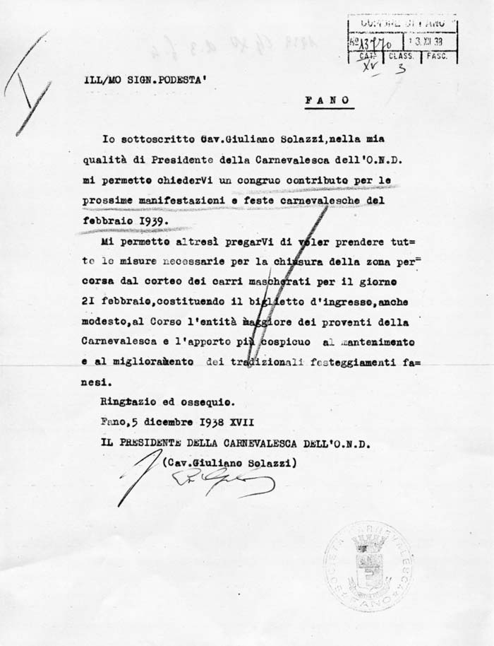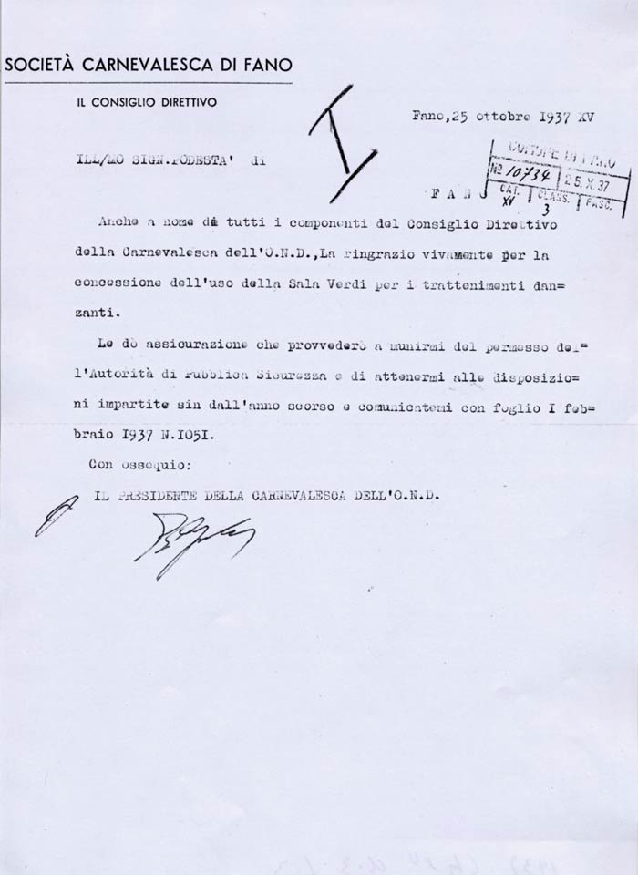 Lettera della Società Carnevalesca al Sindaco di Fano