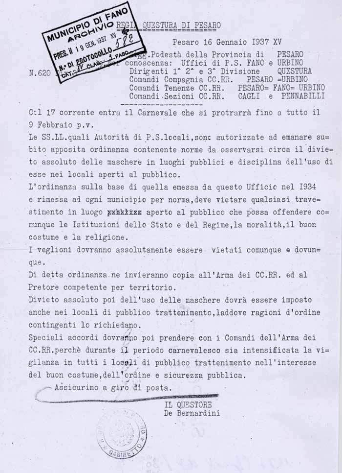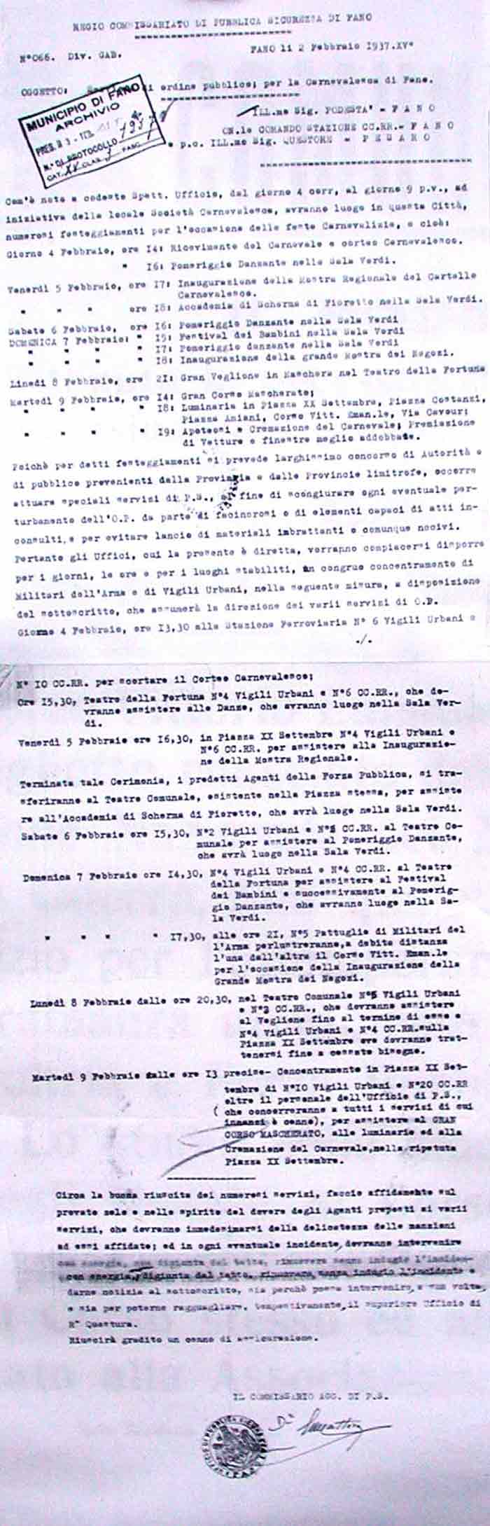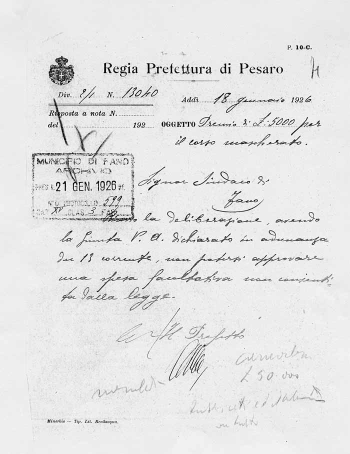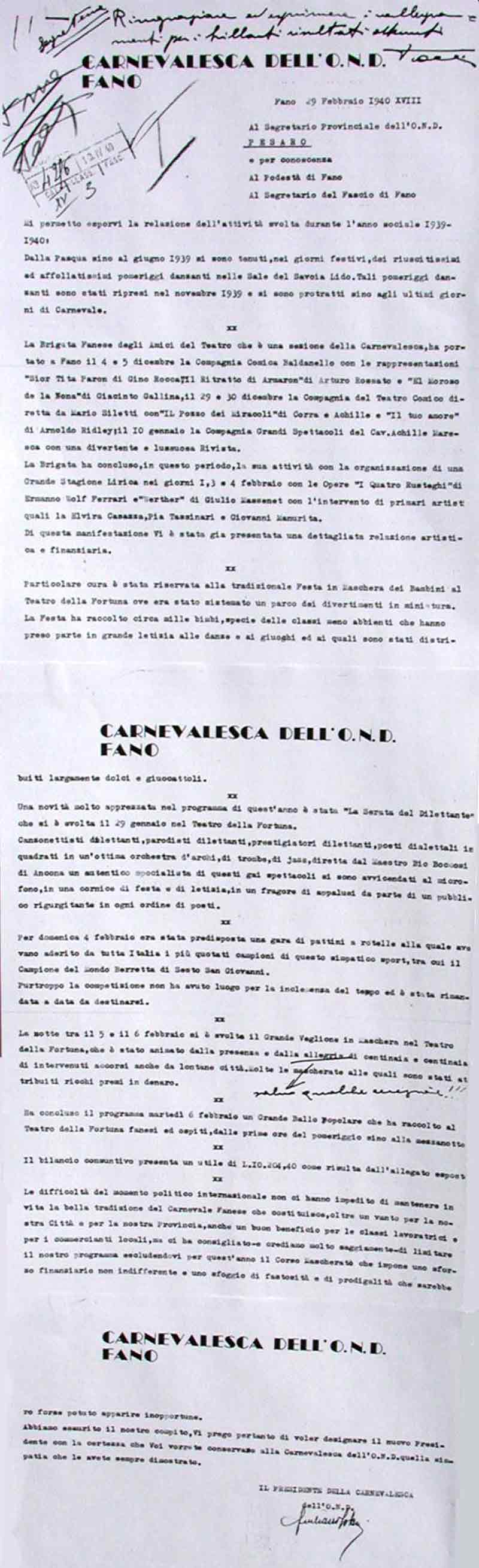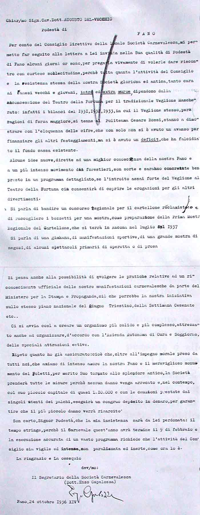 Lettera della Società Carnevalesca al Sindaco di Fano