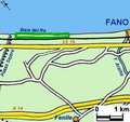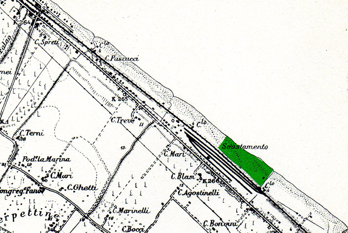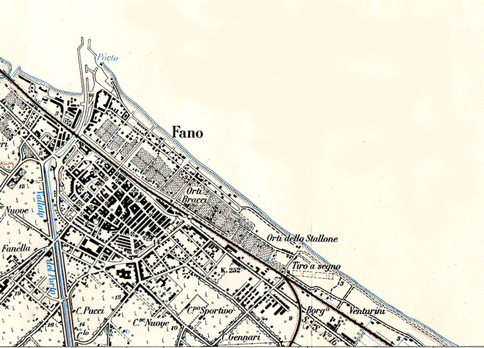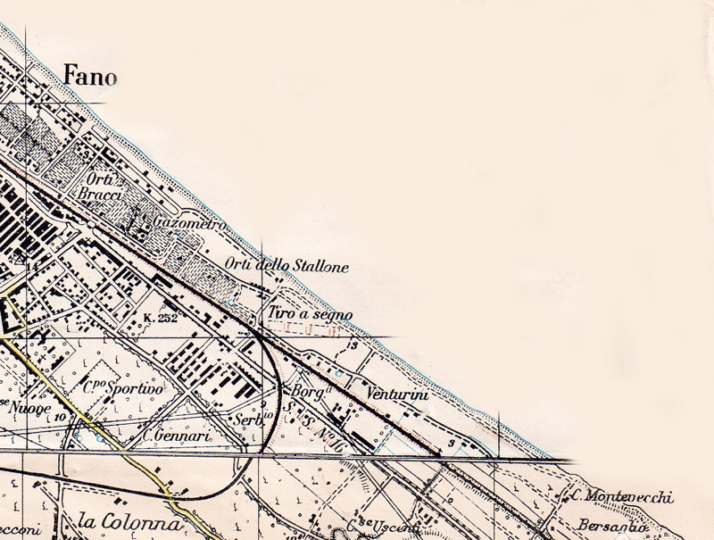Litorale tra Fano e la foce del Metauro. Carta IGM 1:25.000 110 IV S.O. e 110 III N.O., aggiornam. 1948 (autorizz. IGM n. 4877 del 2-11-1998). Dove sono segnati i toponimi Tiro a segno e Venturini è stata in seguito allestita e poi dismessa una pista Go-karts