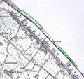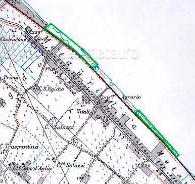 Litorale di Metaurilia (Fano) con i due tratti che ospitano la vegetazione alofila perimetrati in verde. Carta top. Reg. Marche 110 III, autorizz. Uff. Cartografia e Inform. Territoriali Reg. Marche del 13-3-1999