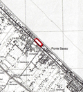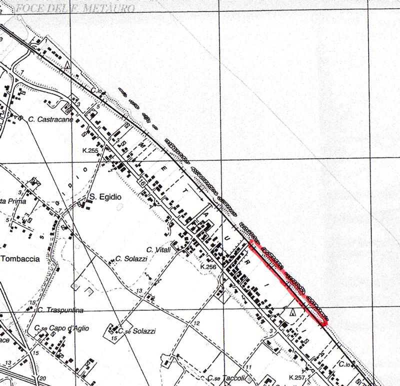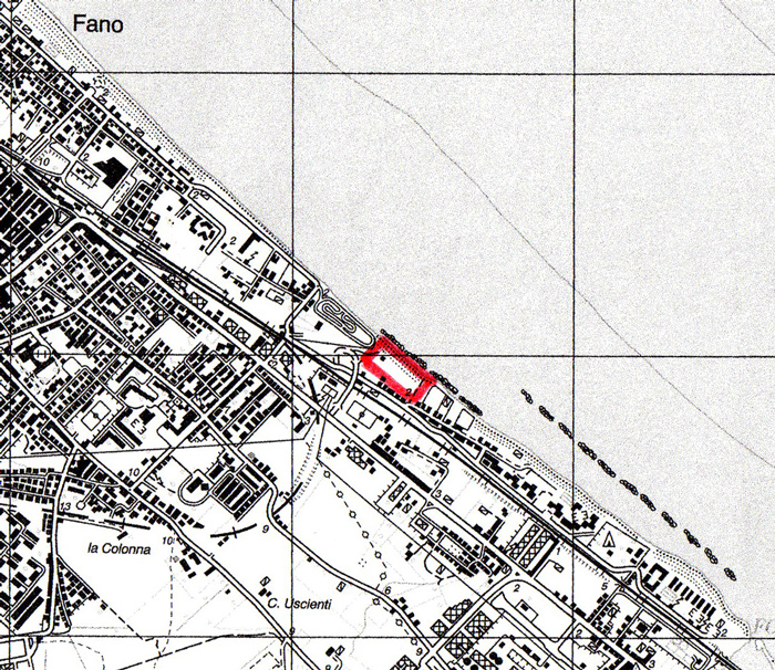 Litorale in loc. Tiro a segno a Fano, perimetrato in rosso. Carta topografica IGM 1:25.000, Foglio 269, sez. III (modificata)