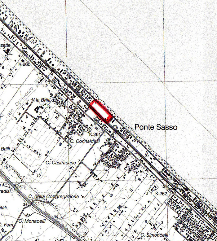 Litorale tra Torrette e Ponte Sasso (Fano), perimetrato in rosso. Carta topografica IGM 1:25.000, Foglio 281, sez. IV (modificata)
