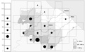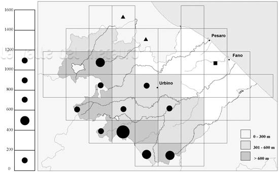 Luscengola - Carta di distribuzione in Provincia di Pesaro e Urbino, 2002. Legenda: cerchio grande = 7 e più rilevazioni dal 1980; cerchio medio = 4-6 rilevazioni; cerchio piccolo = 1-3 rilevazioni; quadrato = dato anteriore al 1980; triangolo = dato fuori dei confini della Provincia. Nel grafico altitudinale: cerchio grande = 15 e più rilevazioni; cerchio medio = 5-14 rilevazioni; cerchio piccolo = 1-4 rilevazioni. Ulteriori notizie nella scheda: Come leggere le schede dei Rettili
