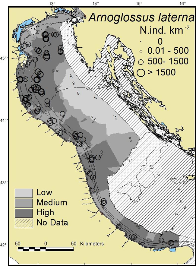 Arnoglossus laterna, carta di distribuzione in Adriatico centrale e settentrionale, 2007-2010 (SCARCELLA et al., SoleMon survey for the study of flatfish stoks in the central and northern Adriatic Sea, international flatfish symposyum, 2011)