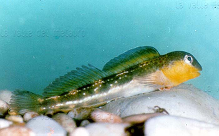 Maschio di Bavosa adriatica con maschera nuziale a guance gialle, scogliere di Fano