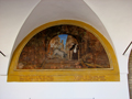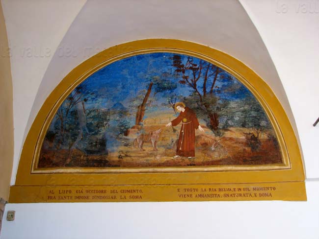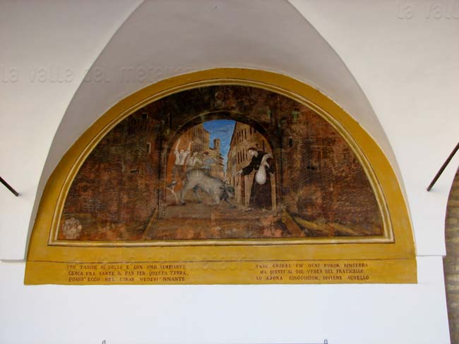 Artista ignoto del 1700: affresco del miracolo del lupo. Portico della facciata del Santuario del Beato Sante a Mombaroccio, marzo 2007