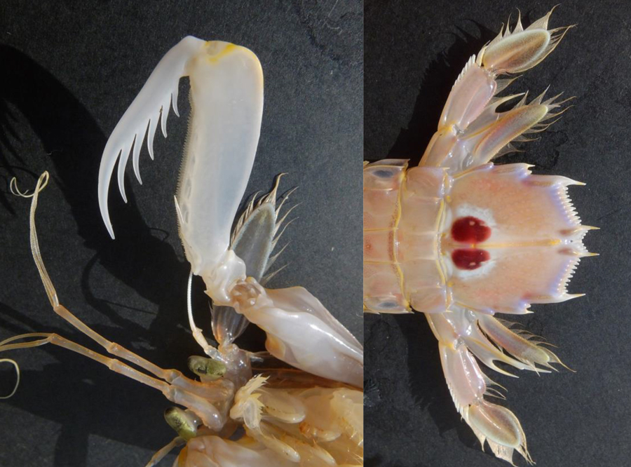 Arto raptatorio e a dx - ventaglio caudale di Squilla mantis di 160 mm, pescherie di Fano, gennaio 2018