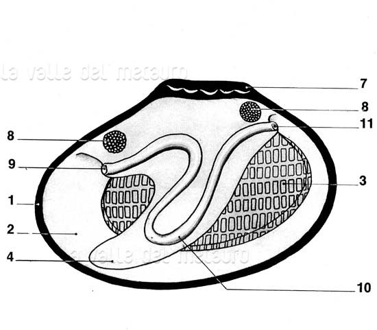 Mollusco Bivalve. 1= conchiglia; 2 = mantello; 3 = branchia; 4 =piede; 7 = cerniera; 8 = muscoli adduttori delle valve; 9 = bocca; 10 = intestino; 11 = apertura anale (da "Natura viva")