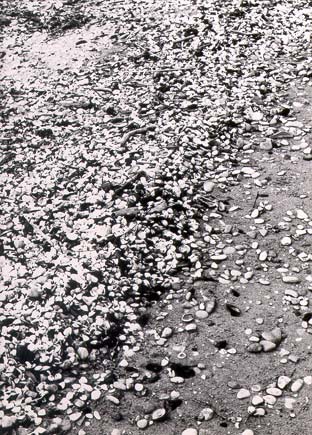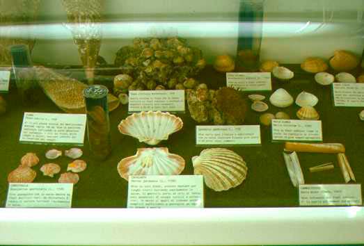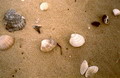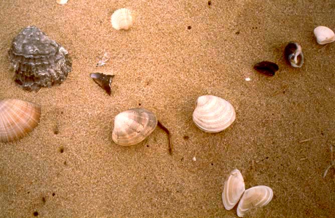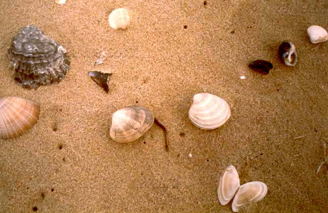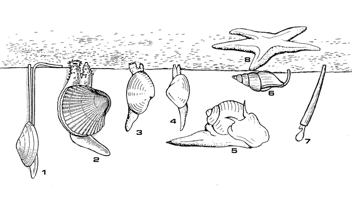 Molluschi del fondale sabbioso e fangoso. 1 - Tellina sp., 2 - Acanthocardia tuberculata, 3 - Paphia sp., 4 - Spisula subtruncata, 5 - Natica stercusmuscarum, 6 - Nassarius nitidus, 7 - Dentalium sp., 8 - Astropecten sp.