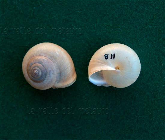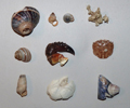 Molluschi terrestri e dulciacquicoli, nidamenti di Murice, Crostacei ed Echinodermi marini da 12 a 32 mm, spiaggiati a Fano, dicembre 2011. Da sinistra a destra: Cornu aspersum (Mollusco terrestre), Pomatias elegans (Mollusco terrestre), Monacha cartusiana (Mollusco terrestre), nidamenti di Murice, Viviparus ater (Mollusco di acqua dolce), chela di Eriphia verrucosa (Crostaceo marino), carapace di Pachygrapsus marmoratus (Crostaceo marino), Rumina decollata (Mollusco terrestre), guscio di Echinocardium sp. (Echinoderma), Balanus sp. (Crostaceo marino) attaccato a un Mitilo
