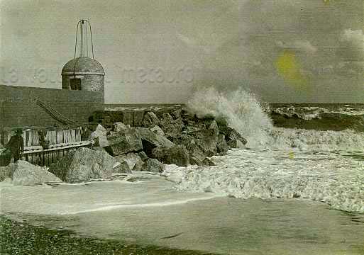 Molo guardiano posto a levante rispetto all'imboccatura del Porto di Fano, con lanterna rossa (foto G. Baviera, fine 1800-primi del 1900)