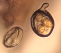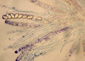 Aschi a sommità amiloide, ottosporici di Sarcosphaera coronaria, Fontecorniale, maggio 2012. Trattati col reagente Melzer si colorano di blu