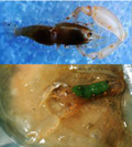 Ascidonia flavomaculata: in alto: esempl. di 18 mm, 36 miglia al largo di Fano, marzo 2008, trovato all’interno di un’ascidia (foto C. Ciabotti); in basso: entro un’ascidia, Golfo di Venezia, novembre 2002 (foto R. Gattelli)