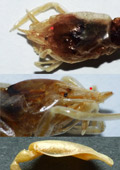 Ascidonia flavomaculata di 18 mm (esempl. conservato), con indicato in rosso il rostro, 36 miglia al largo di Fano, marzo 2008, trovato all’interno di un’ascidia. In basso la sua chela più grande con bordo inferiore affilato